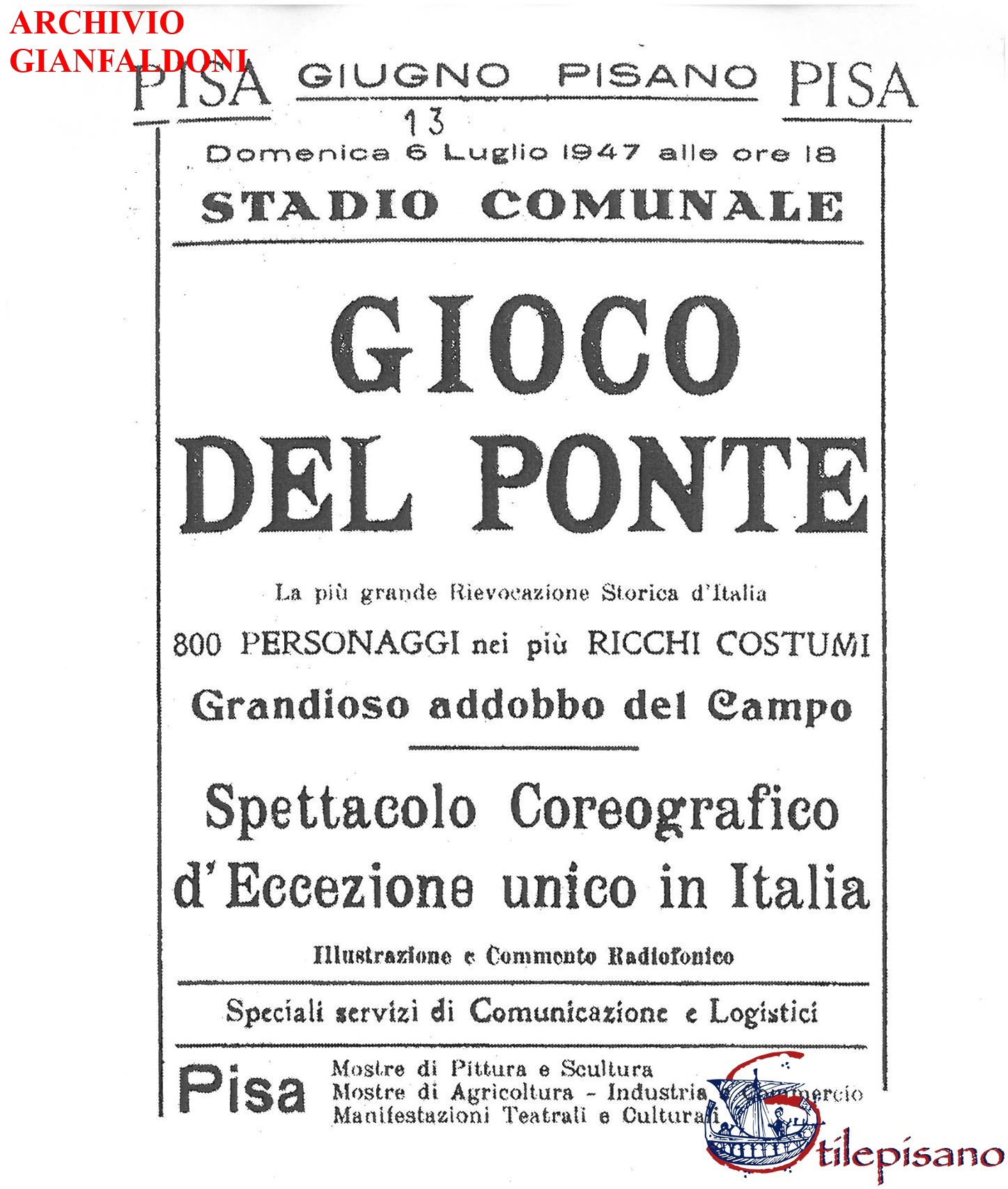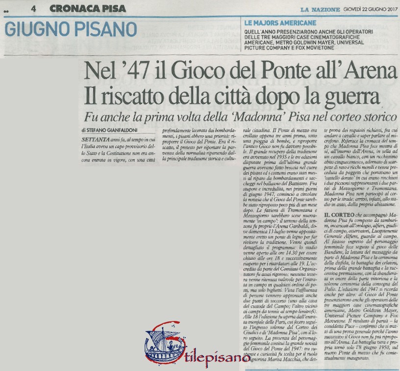 Settanta anni fa, al tempo in cui l’Italia aveva un Capo provvisorio dello stato e la Costituzione non era ancora entrata in vigore, con una città profondamente lacerata dai bombardamenti, i pisani ebbero una priorità: riproporre il Gioco del Ponte. Era il riscatto, il pretesto per riportare la parvenza della normalità ripartendo dalla principale tradizione storica e culturale cittadina. Il Ponte di mezzo era crollato appena tre anni prima, sotto una pioggia di bombe, e riproporre l’antico Gioco non fu davvero possibile. Il grande recupero della tradizione era avvenuto nel 1935 e le tre edizioni disputate prima dell’ultima grande guerra avevano fatto breccia nel cuore dei pisani ed i costumi erano stati messi al riparo da bombardamenti e saccheggi nel ballatoio del Battistero. Fra stupore e incredulità, nei primi giorni di giugno 1947, cominciò a circolare la notizia che il Gioco del Ponte sarebbe stato riproposto poco più di un mese dopo. Le fazioni di Tramontana e Mezzogiorno sarebbero scese nuovamente “in campo”: il terreno della tenzone fu proprio l’Arena Garibaldi, dove domenica 13 luglio venne appositamente eretto un ponte di legno per far rivivere la tradizione. Venne quindi dettagliato il programma: lo Stadio venne aperto alle ore 14.30 per essere chiuso alle ore 18 e successivamente riaperto per i ritardatari alle 19. L’accredito da parte del Comitato Organizzatore fu assai rigoroso: nessuna tessera venne ritenuta valevole per l’entrata in campo in qualsiasi ordine di posti, ma solo biglietti. Vista l’affluenza di persone vennero approntati anche due punti di soccorso (uno presso la casa del custode del Campo; l’altro presso i campi da tennis al tempo limitrofi). Alle 18 l’edizione fu aperta dall’entrata trionfale delle Parti, cui fecero seguito l’ingresso solenne del Corteo dei Giudici e di “Madonna Pisa”, con il loro seguito. La presenza del personaggio femminile costituì la grande novità del Gioco del Ponte del 1947: tra suspense e curiosità fu scelta per il ruolo la signorina Marisa Macchia che dette prova dei requisiti richiesti, fra cui andare a cavallo e saper parlare al microfono. Riferisce la cronaca del tempo che Madonna Pisa fece mostra di sé, all’interno dell’Arena, in sella ad un cavallo bianco, con un ricchissimo abito cinquecentesco, adornato di scarpette di raso e ricchi monili e venne preceduta da paggetti che portavano un “castello dorato” in cui erano rinchiusi i due piccioni rappresentanti i due partiti di Mezzogiorno e Tramontana. Madonna Pisa non partecipò al corteo per le strade: arrivò, infatti, allo stadio in auto, dalla propria abitazione.