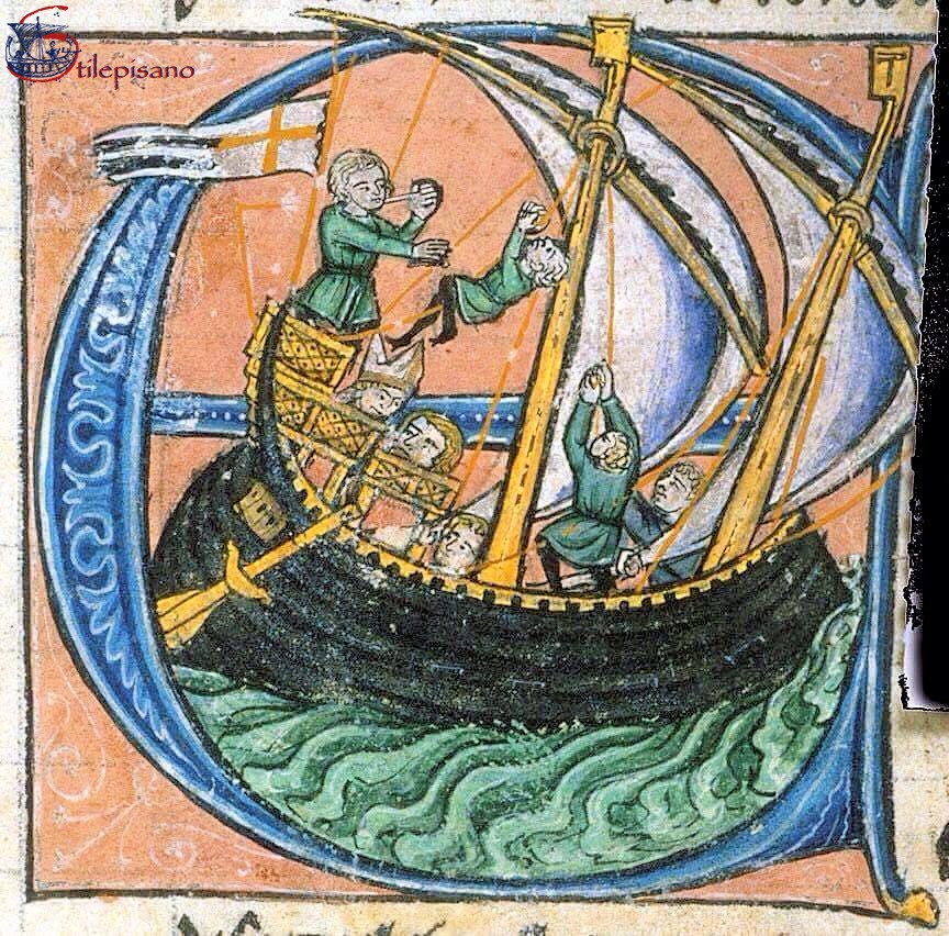 In questa miniatura, tratta da un’edizione dell’Histoire d'Outremer del XIII secolo, vediamo Daiberto (o Dagoberto) Lanfranchi (Pisa, 1050 - Messina, 1105) e Boemondo d'Altavilla (1058 - Canosa di Puglia, 1111), in navigazione con la croce di S. Andrea. Si può notare in alto a destra sulla coffa di osservazione dell'albero di prua della nave una Tau.